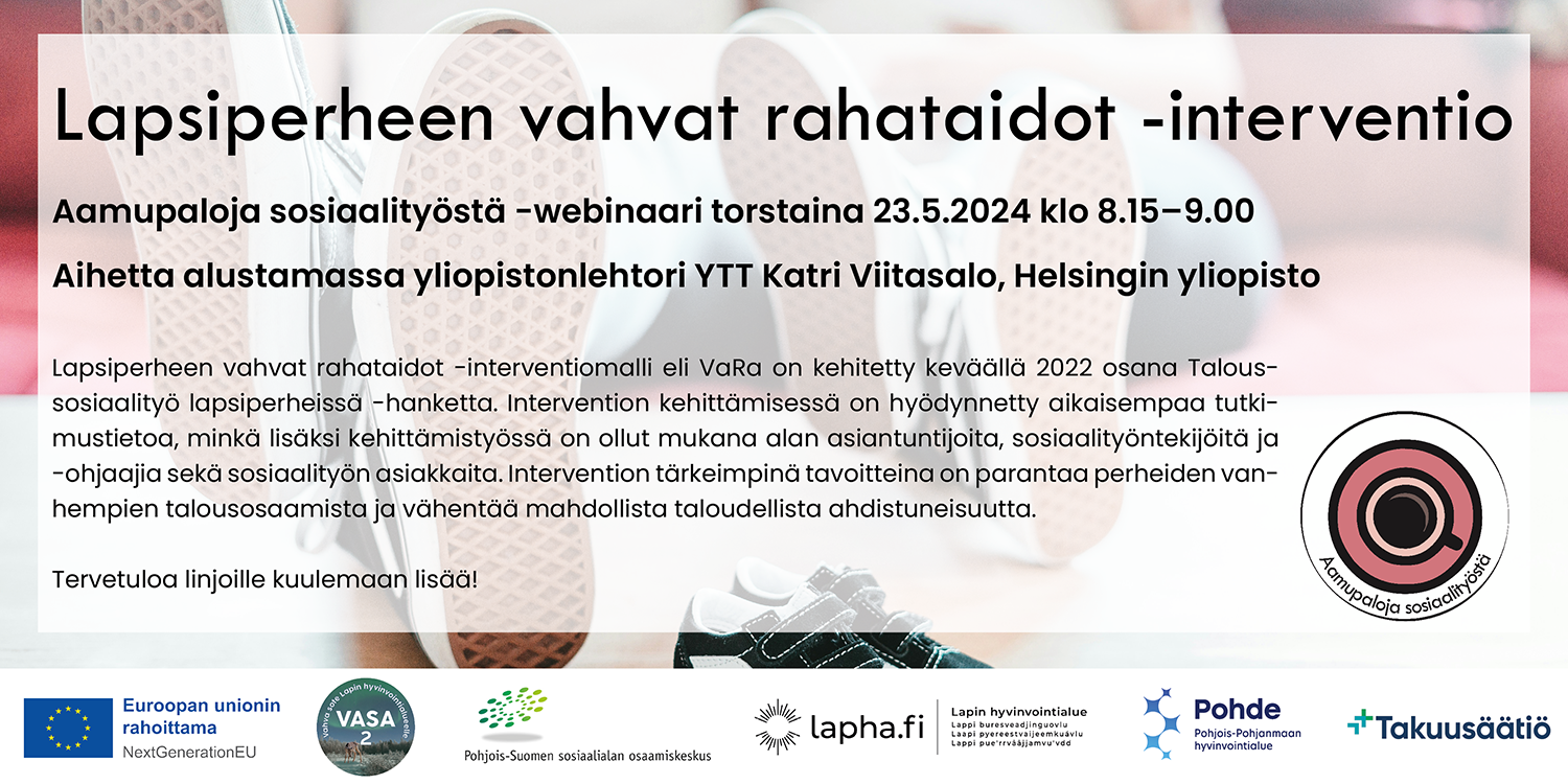 Toukokuun webinaarin teemana on Lapsiperheen vahvat rahataidot -interventio, jota alustaa yliopistonlehtori YTT Katri Viitasalo Helsingin yliopistosta.